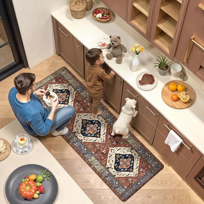 - Versatile: Boho style design features a central medallion and floral motifs in the style of rugs,easily to match your kitchen decor,bright your home.Soft thick foam provides ample support for standing in kitchen sink,laundry room, office,bathroom,dinning room,or any other high-traffic area