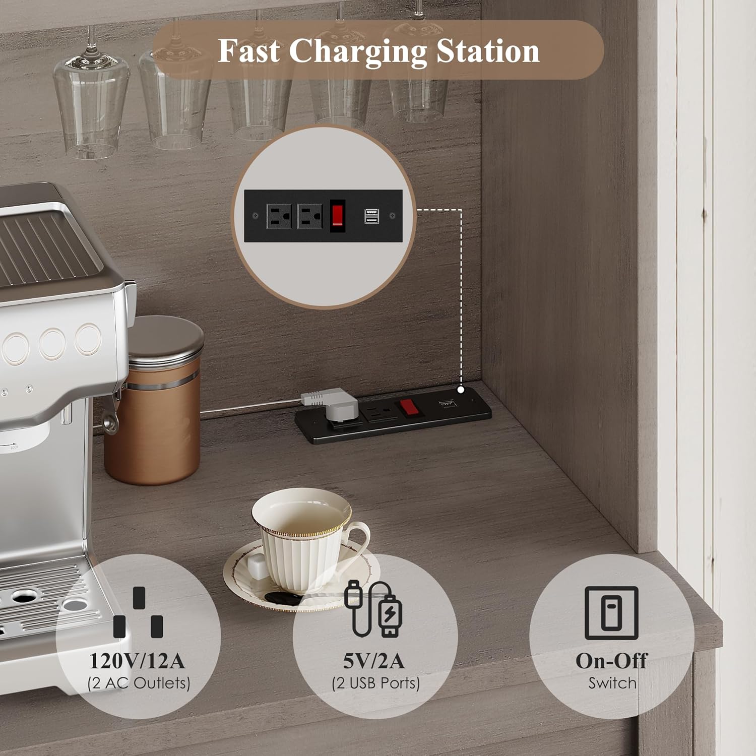 - Practical Design: Equipped with a built-in outlet for convenient device charging and a wire hole for organizing wires, this kitchen pantry cabinet has a nearly 4-foot wide countertop that easily fits microwaves and coffee makers. Besides, the bottom cabinet includes two adjustable shelves for customized organization