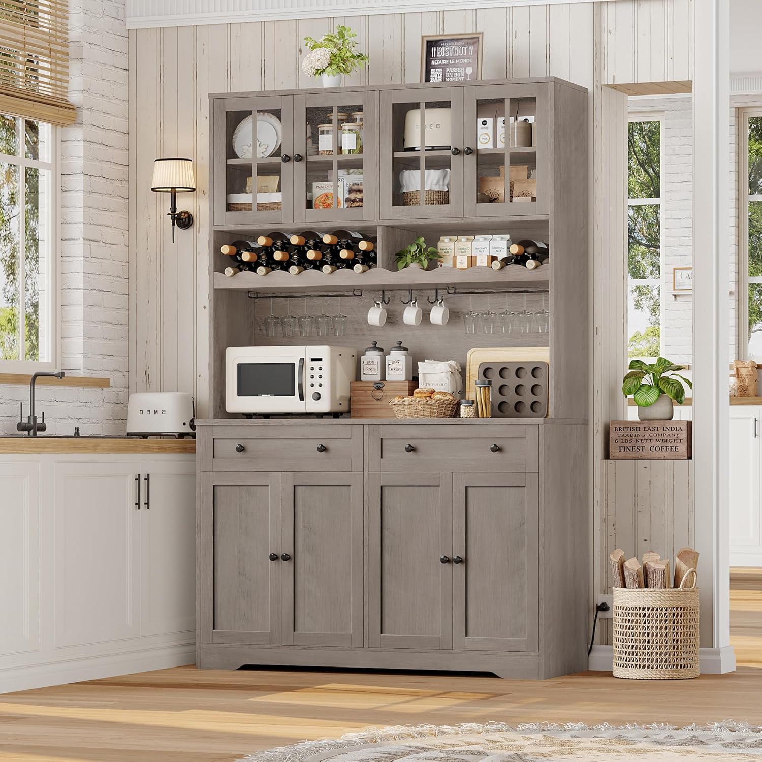 - Ample Storage: Revamp your kitchen with this kitchen pantry, designed for all kinds of storage. Upper featuring 4 glass doors, curved wine racks, mug hooks, and stemware racks to keep items within easy reach, it also has a spacious countertop, two deep drawers, and a 4-door cabinet that integrates all in one to supply copious storage solutions