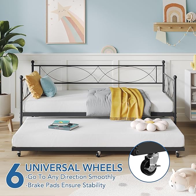 - [Space-saving Daybed] - This Metal Day Bed with Pull Out Trundle can be easily placed against the wall in your bedroom, guest room, or living room, serving as a comfortable guest bed. The daybed with trundle is particularly well-suited for small spaces and is an ideal choice for siblings who need to share a room.