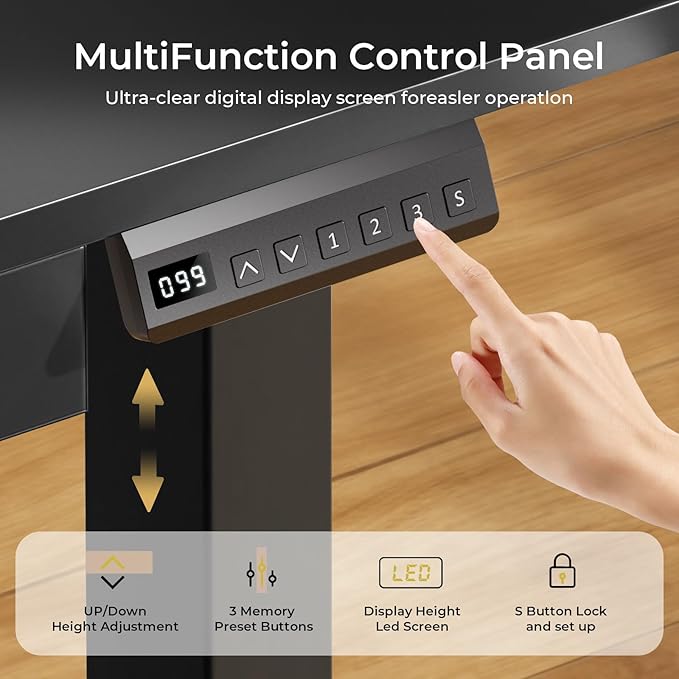 - Customizable Led Control Panel: Our standing desk is designed to meet your needs, featuring an LED display and three memory presets for quick and precise height adjustments. The sturdy desktop, supported by a T-shaped steel frame, guarantees exceptional stability and can hold up to 176 lbs