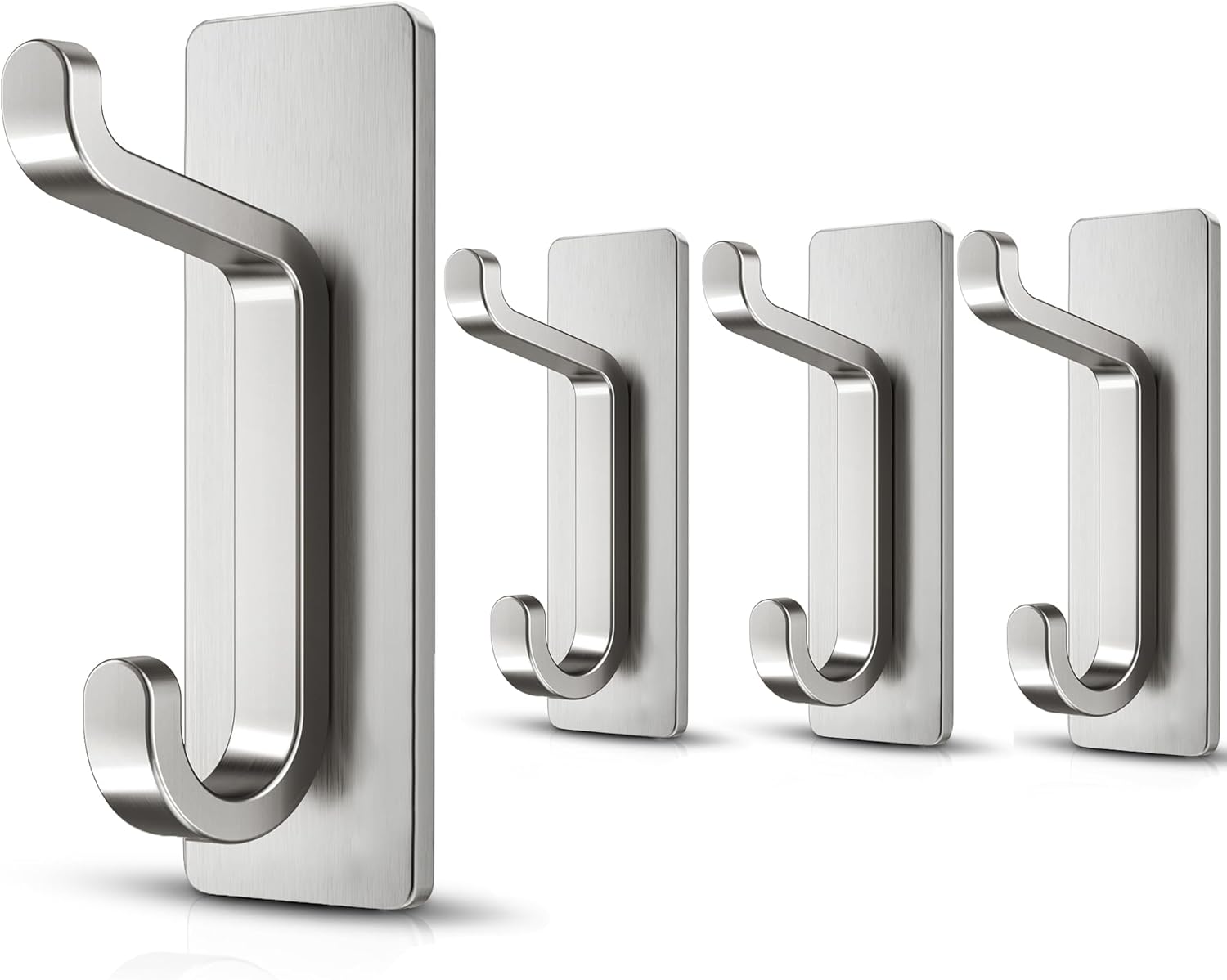 Self Adhesive Wall Hooks for Hanging: Extra Strong 13 LB, Hook for Coat, Towel in Bathrooms, Shower, Kitchen, Wall, Door Hook, Nickel Silver 4 Pack