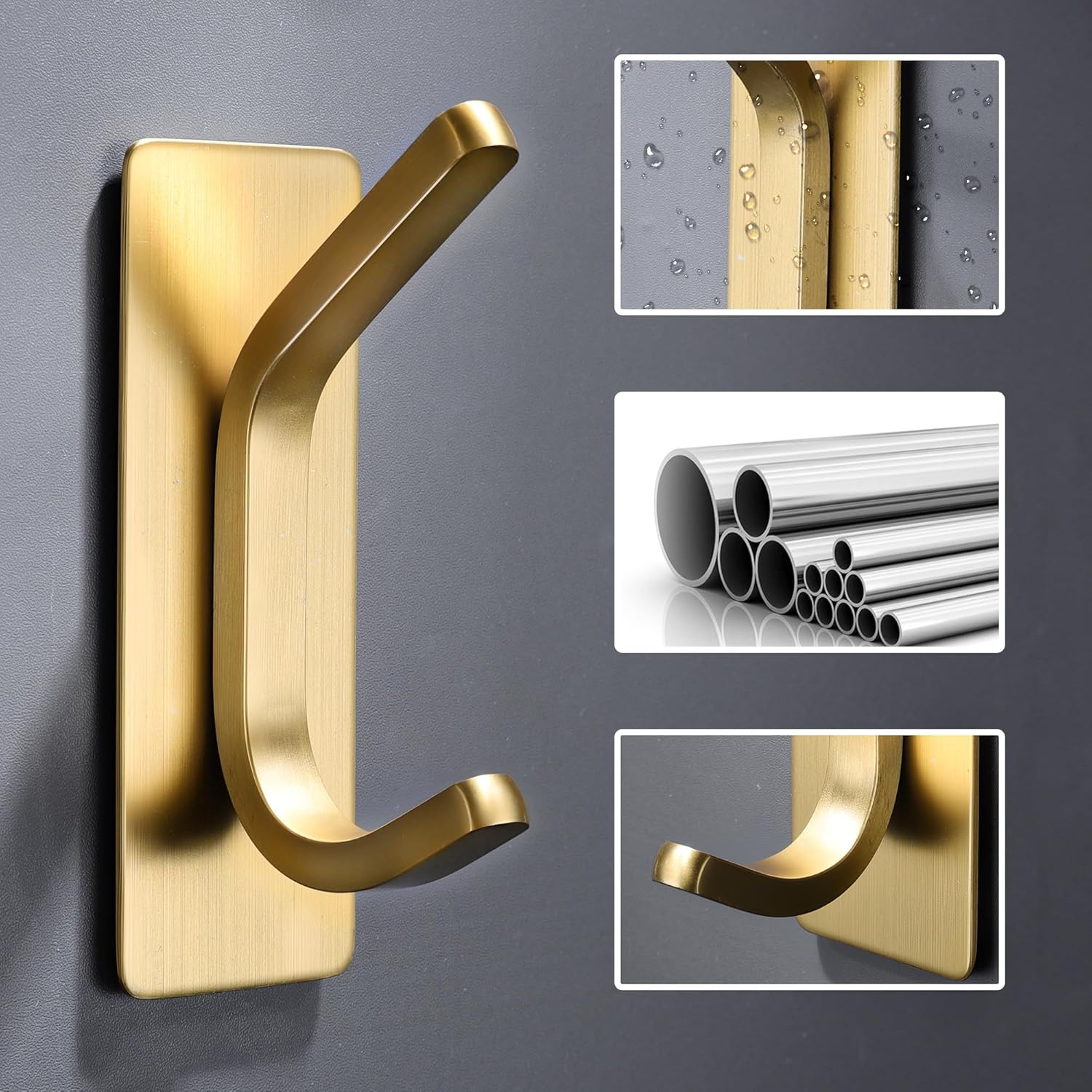 - Stylish K-shaped Design: The towel hook features a unique "K" shape design with double hooks for hanging more items. It saves space and keeps your bathroom neat and tidy. The adhesive hook has a gold finish that adds a touch of luxury to any space