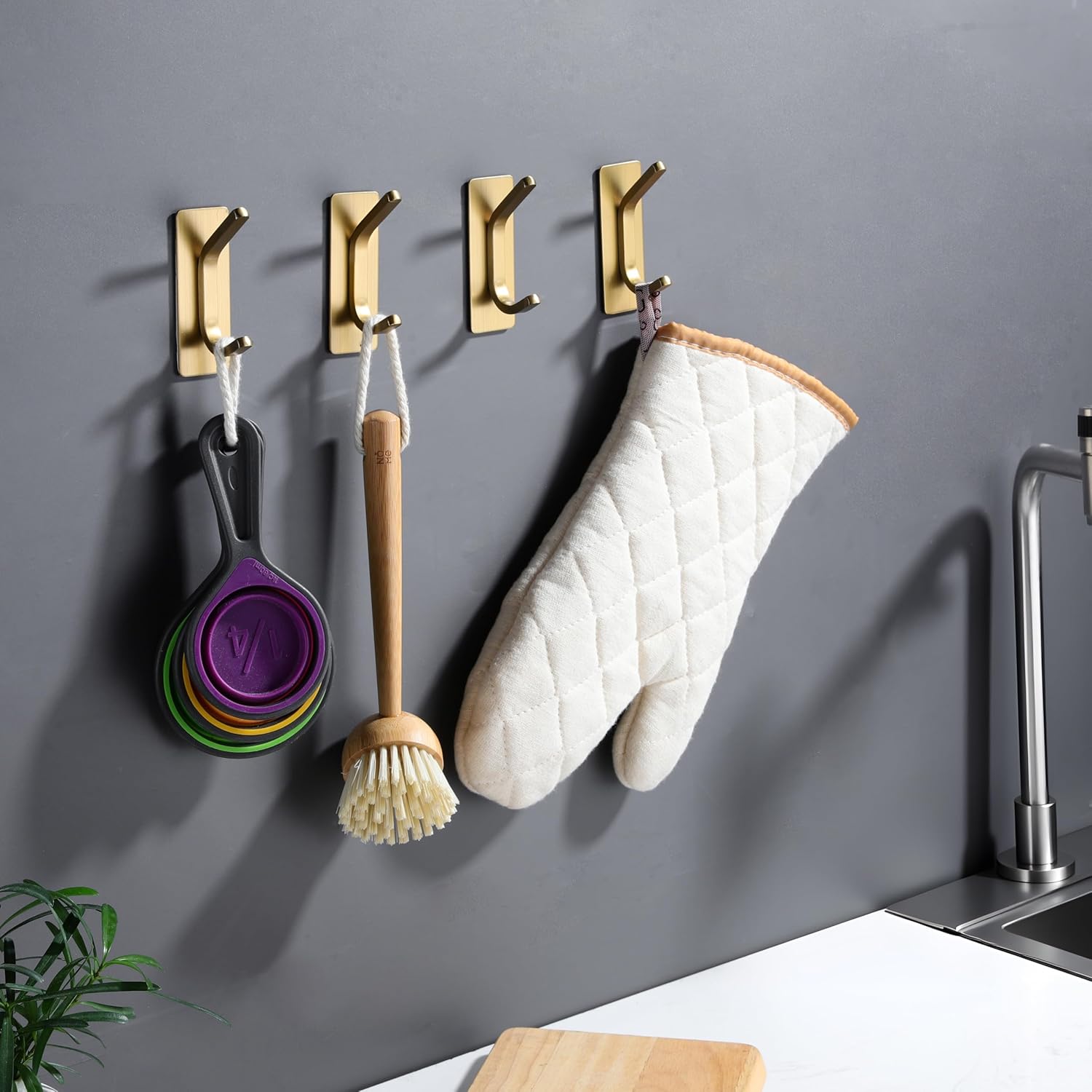 DELITON Gold Adhesive Hooks - 4 Pack Heavy Duty Stainless Steel Towel Hooks for Bathroom, Kitchen, No Drill Stick on Wall Hook for Hanging Robe, Coat, Clothes
