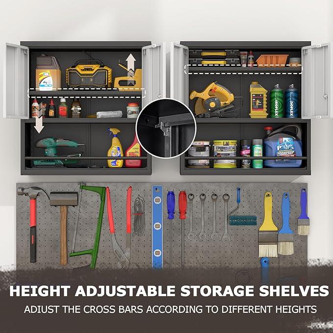 - 【Spacious Storage Space】This garage wall cabinet with adjustable shelves meets your storage needs for items in different sizes. And the open shelf adds the stability of this metal storage cabinet. The extra shelf with guardrail makes it easy to store temporary items