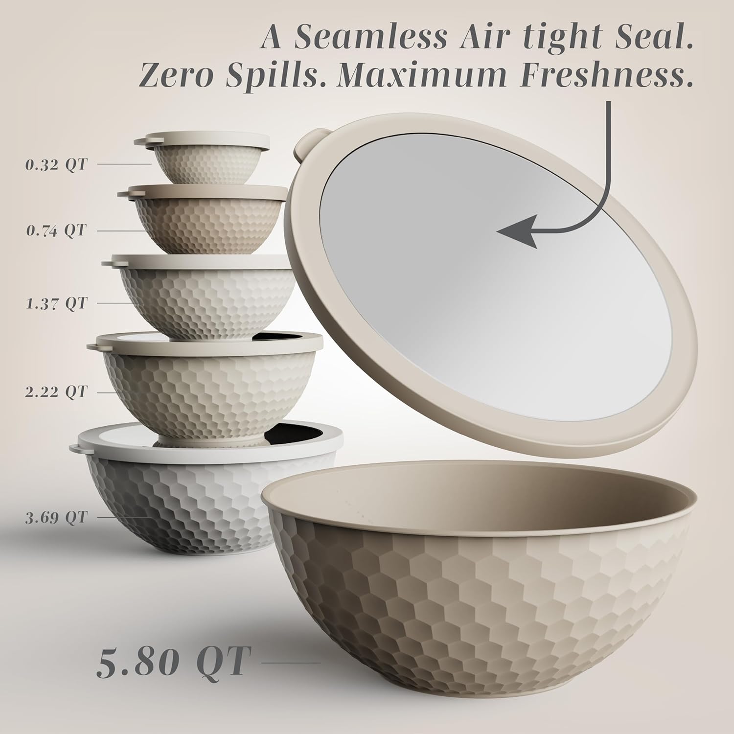 - Set includes 6 plastic bowls and 6 TPR lids; Bowl capacity of 0.32 QT, 0.74 QT, 1.37 QT, 3.69 QT and 5.8 QT.