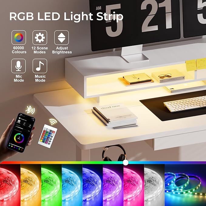 - Gaming Desk with Colorful LED Lights: This gaming desk features RGB LED lights with 12 scene modes and 5 adjustable brightness levels that can be switched cyclically. The adjustable standing desk also includes a built-in power strip with 2 AC outlets and 2 USB charging ports, making it convenient to charge your devices such as cell phones, tablets, and notebooks. This computer desk functionality for your gaming and work needs