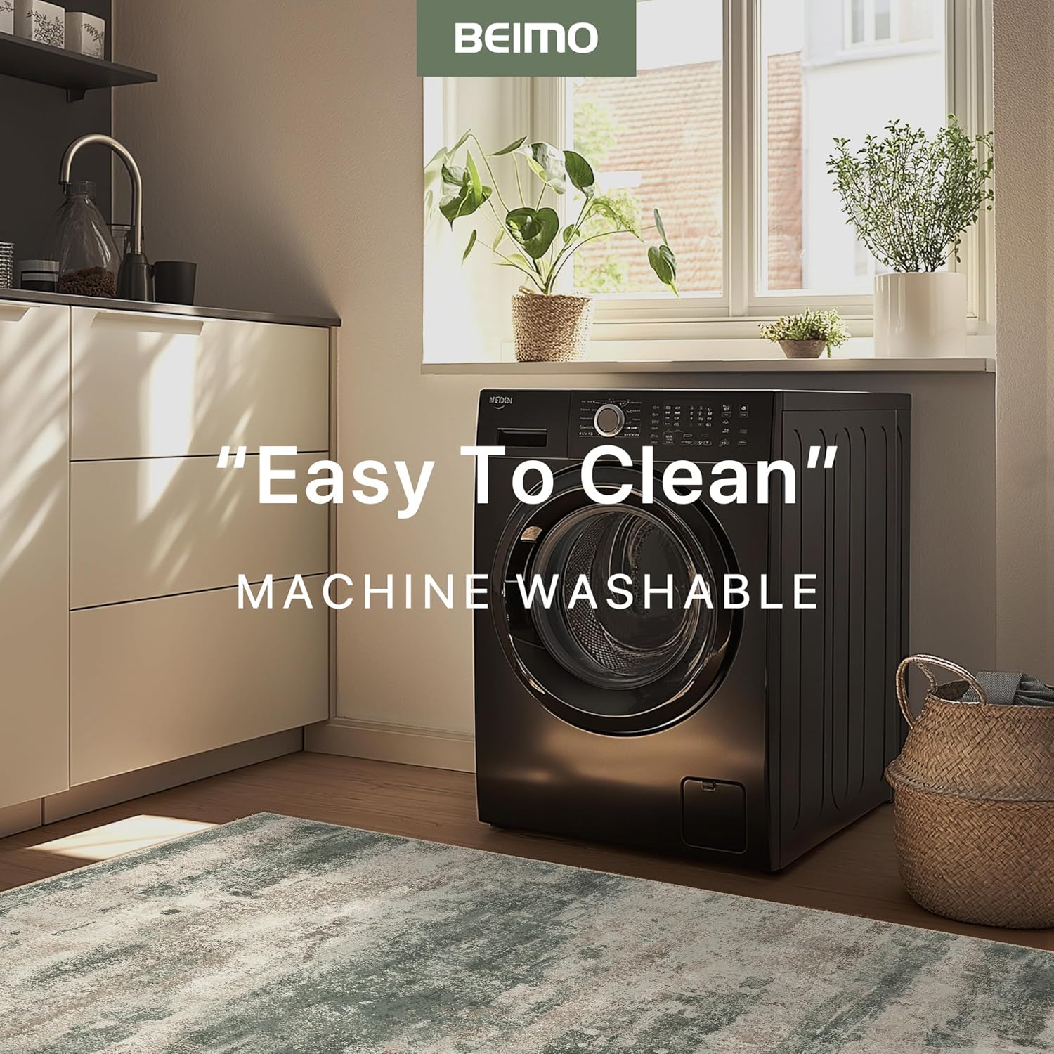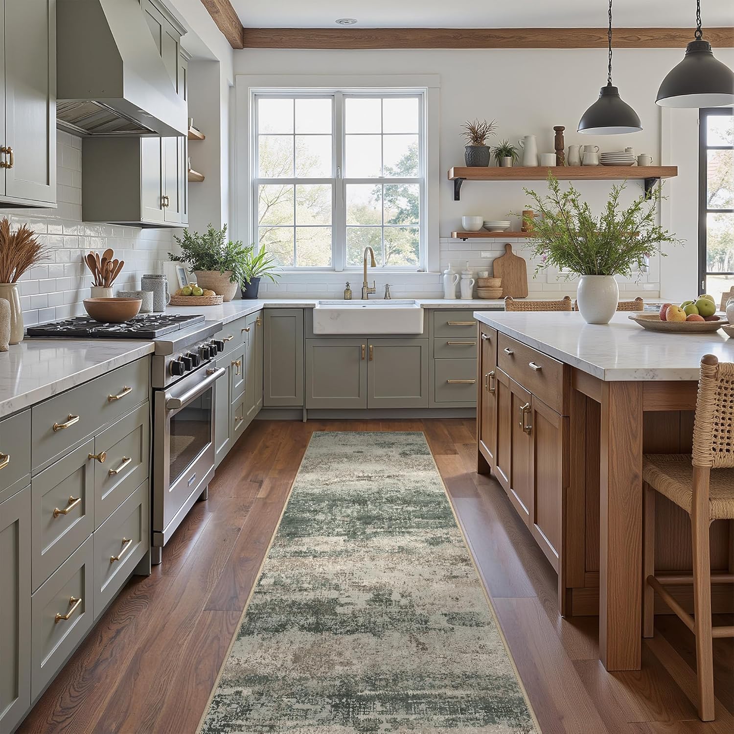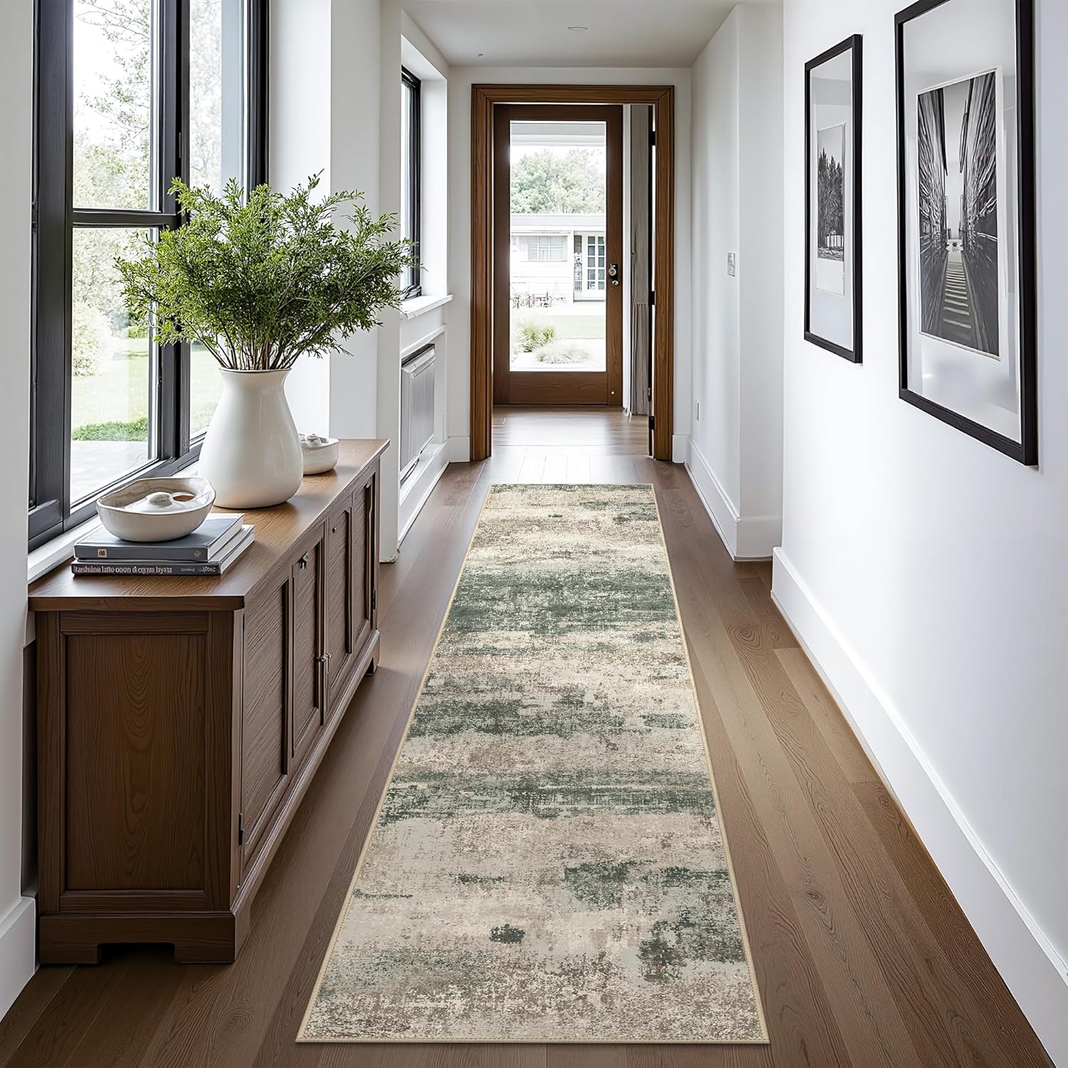 - Contemporary Printed Design: Enhance your room with our machine washable runner rug for living room featuring a muted green and beige abstract pattern. The modern design exudes artistic flair, while the color complements various interiors. Expertly crafted for lasting appeal, this chic runner rug for bedroom effortlessly elevates hallway, or kitchen with a touch of sophistication