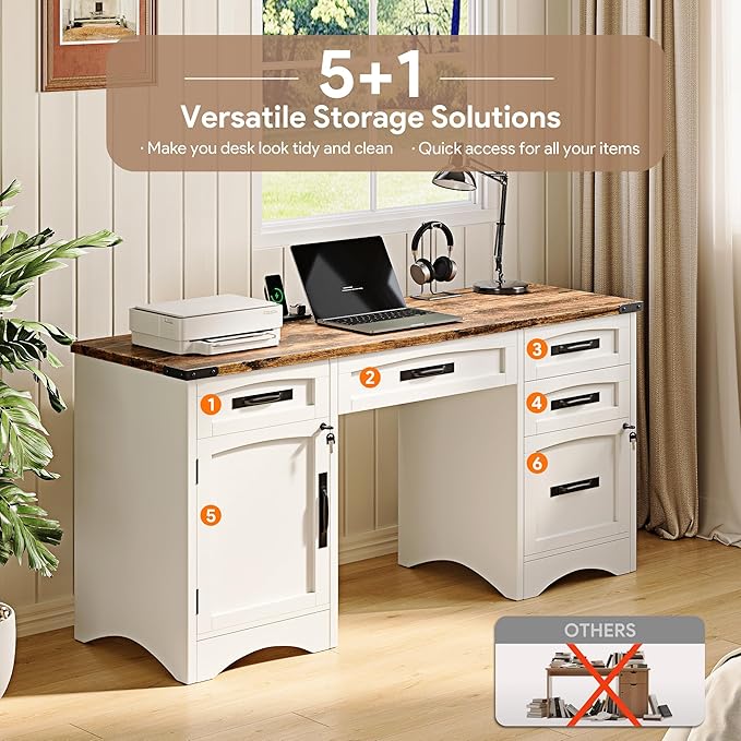 Farmhouse Executive Desk with Drawers, 55" Home Office Desks with Fast Charging Station, Lockable File Cabinet, Wood Writing Computer Desk for Work, Study, White