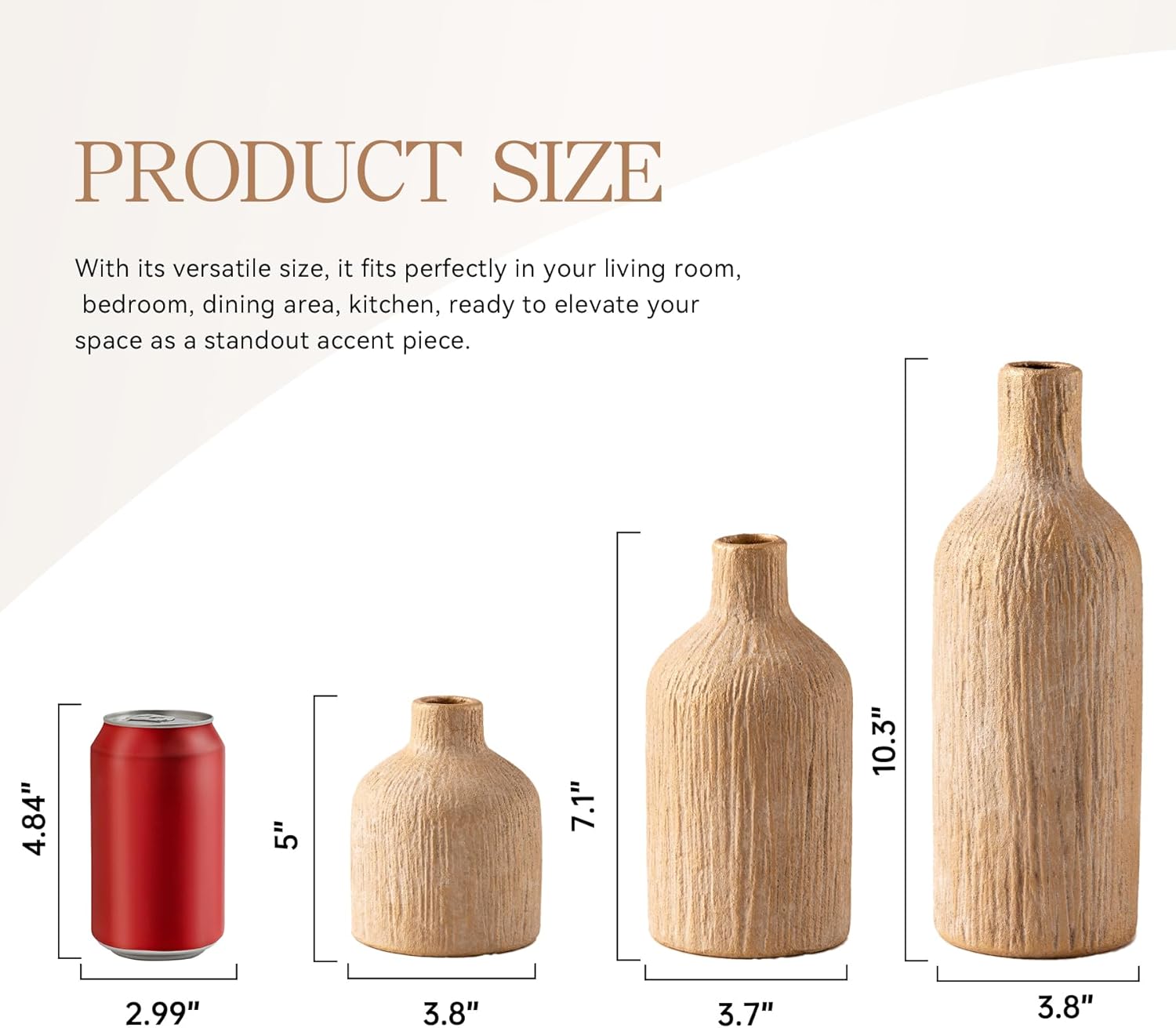 - 【Perfect Size】Large: 3.8"L × 10.3"H;Medium: 3.7"L × 7.1"H;Small: 3.8"L × 5.0"H. Featuring intricate detailing and a rich texture, this vase complements a variety of home styles—farmhouse, rustic, country, even modern. It effortlessly blends in with existing furniture and accessories, adding a timeless charm and harmonious look to your space.