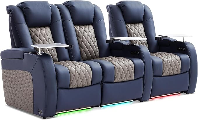 Home Theater Seating, Top Grain Leather Movie Seats Recliner Chair, Zero Gravity Reclining Gaming Sofa with Power Headrest 7 Colors Ambient Lighting 3 Seats Loveseat Left Blue Grey
