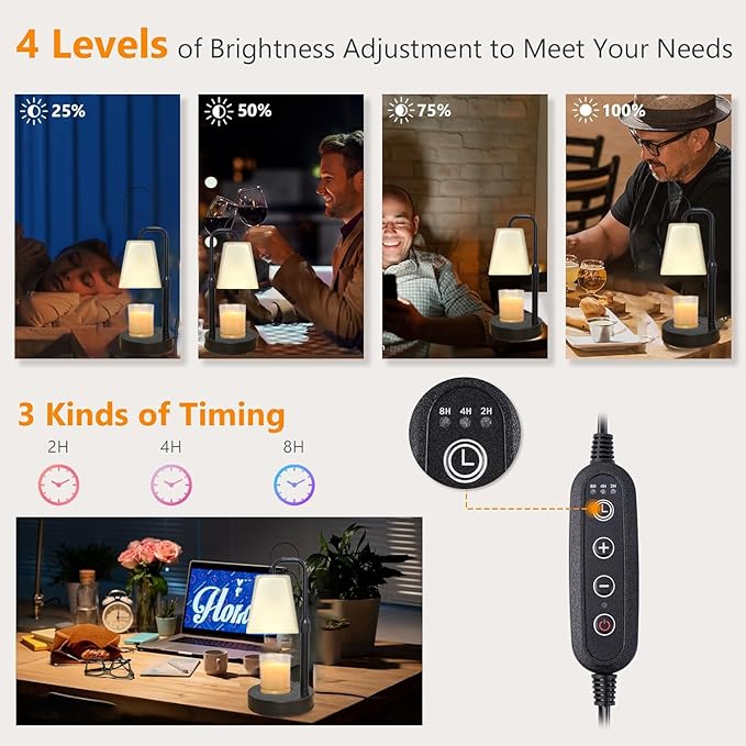 - âĄăTimer-Equipped Candle Warmer Lamp & Fast MeltingăMelts wax evenly in just 5 minutes using the included GU10 bulbâlow-temperature heating preserves fragrance notes longer. Features 2H/4H/8H auto-off timer for worry-free ambiance control, ideal as a desk lamp or beside your bedtime novel.