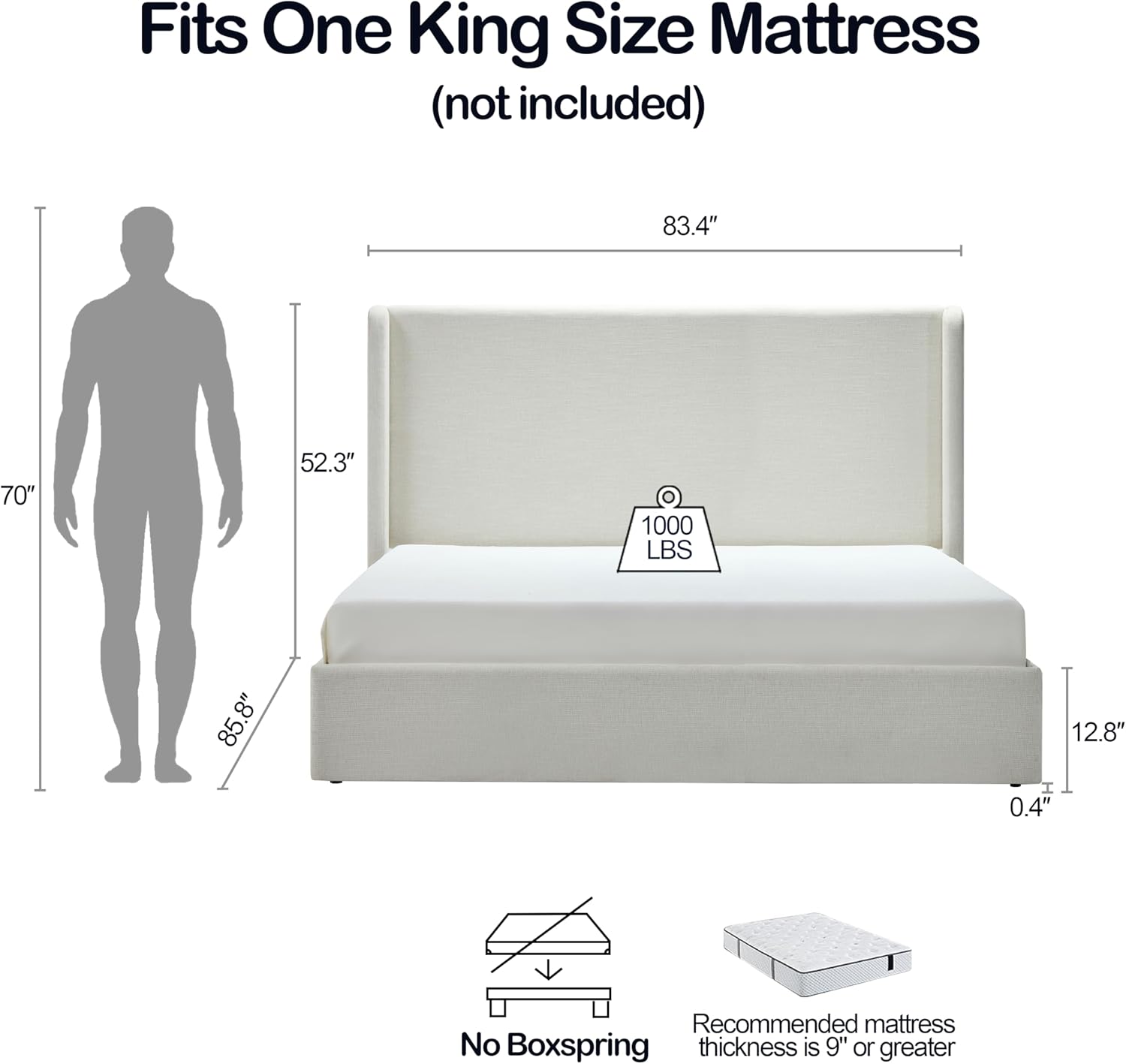 King 52.3" Tall Headboard Carmen Wingback Upholstered Platform Bed Frame Premium Textured Canvas Chenille Elegant Simplicity for Bedroom No Box Spring Needed Easy Assembly No Noise Ivory