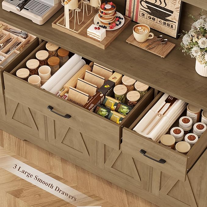 - Crafted To Last: Crafted from high-quality MDF and completed with reinforced structure, this wide wood pantry with drawers ensures superior stablility and durability for lasting use, while the anti-tipping device exsits for enhanced safety. Overall size: 55.1"W x 15.7"D x 71"H