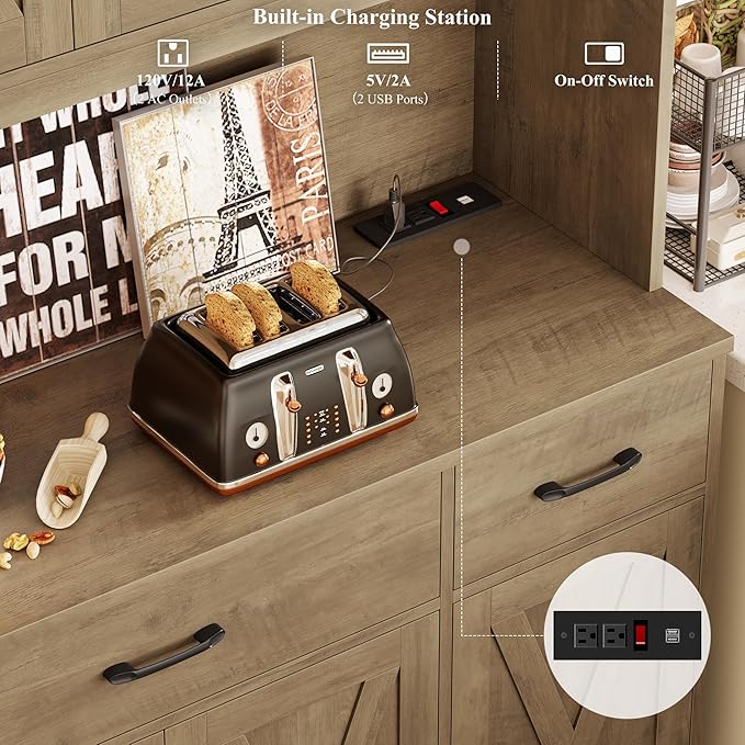 - Power Outlets: Featured a built-in charging station with 2 AC outlets, 2 USB ports and a handy switch, this tall pantry cabinet powers conveniently home appliances like toaster and coffee maker while providing quick power on and off for enhanced safety and reliability