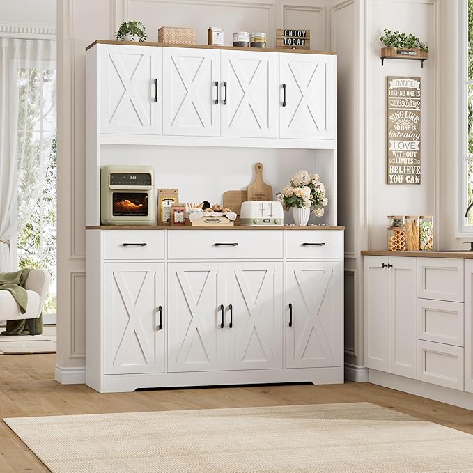 - Modern Farmhouse Hutch: Warm wood finish, striking X-grain barn door and two-tone design, all of which combines rustic appeal with contemporary style in this white pantry cabinet in a beautiful way that complements perfectly into any space