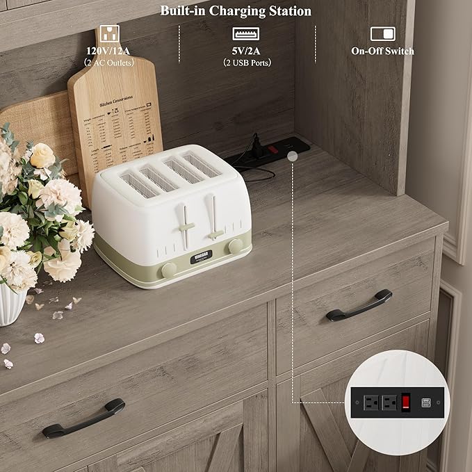 - Power Outlets: Featured a built-in charging station with 2 AC outlets, 2 USB ports and a handy switch, this tall pantry cabinet powers conveniently home appliances like toaster and coffee maker while providing quick power on and off for enhanced safety and reliability