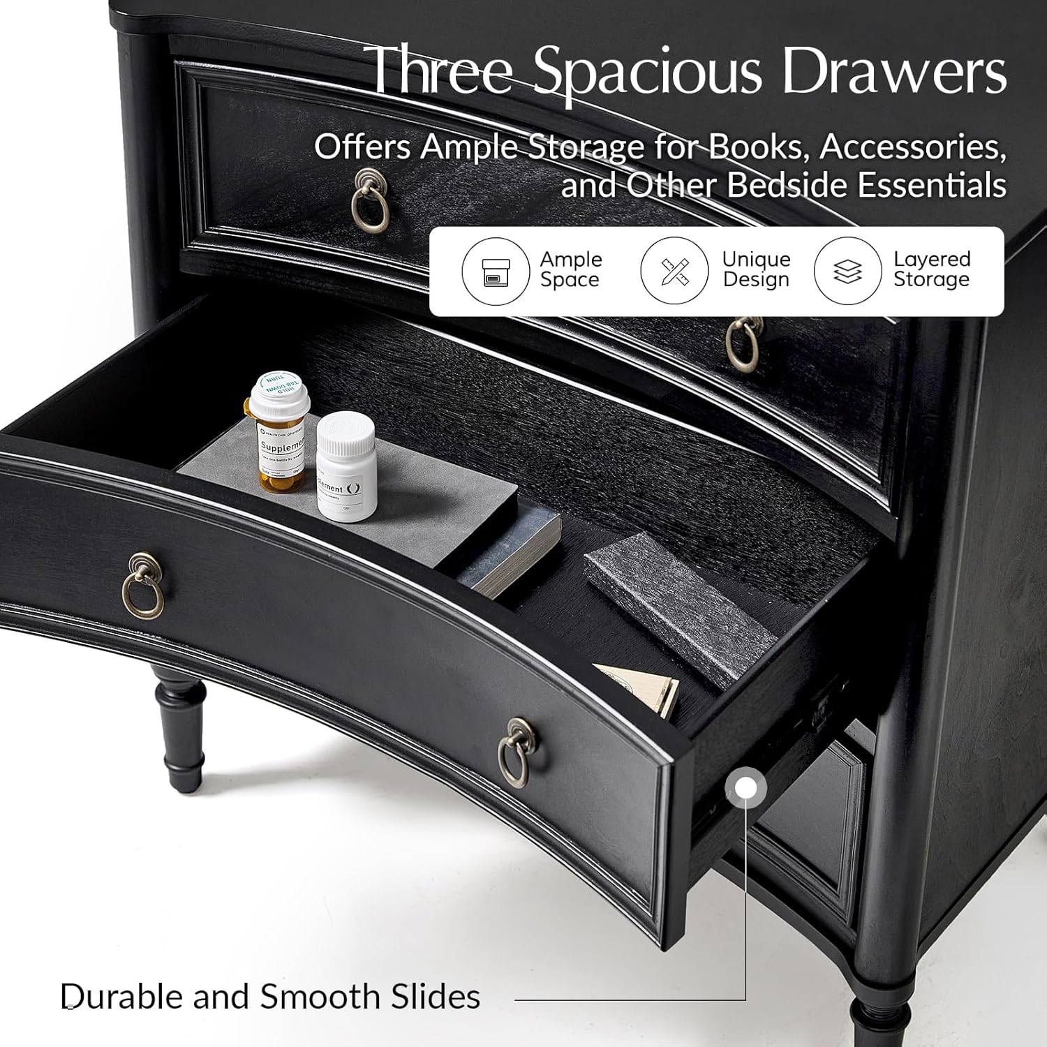 HULALA HOME 3 Drawer Nightstand with Charging Station, 26" Wide Nightstand with Solid Wood Legs and Curved Profile, Classic Bedside Table for Living Room Bedroom, Black