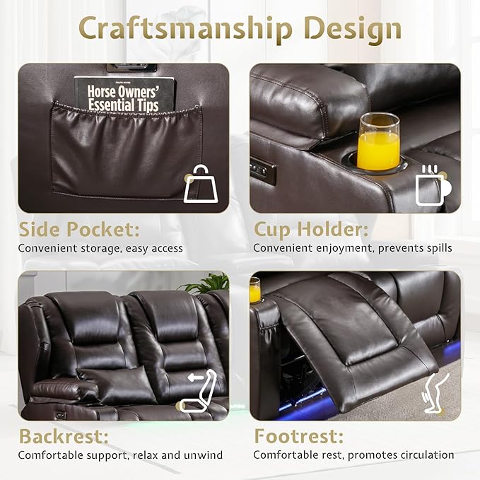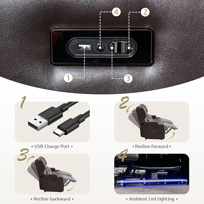 - Flip-Up Backrest: Flip up the backrest to create a separate seat. When lowered, it transforms into a practical wooden tabletop. Stay powered up with USB-A, USB-C ports, and 2 power outlets for charging devices. Enjoy four-color LED lighting at the base for a cozy, cinematic vibe. Perfect for movie nights, relaxing, or working from home