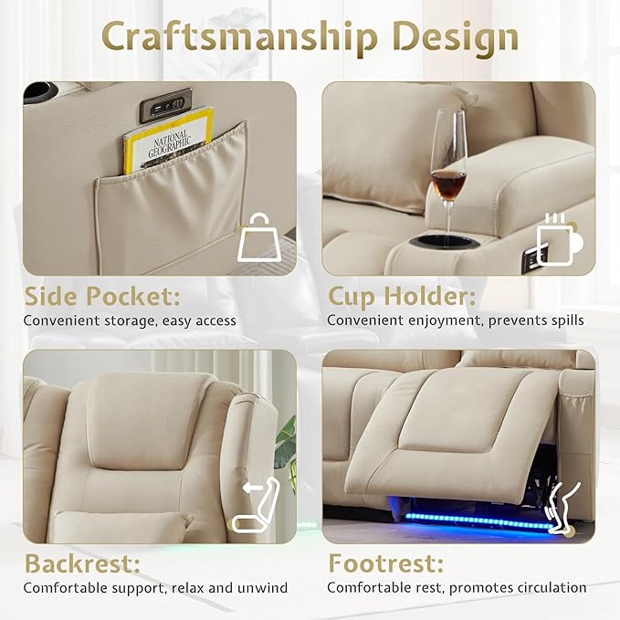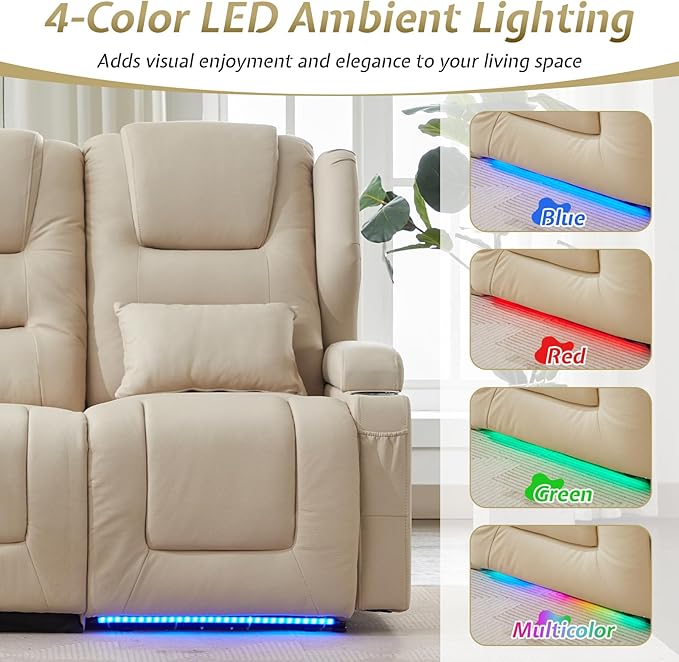 SAMERY Power Loveseat Recliner Sofa with Adjustable Split Back, Multi-Port Charger, Flip-Up Backrest & LED Lighting - Home Theater Seating with Storage, Cup Holders, Beige Fabric Loveseat Recliner