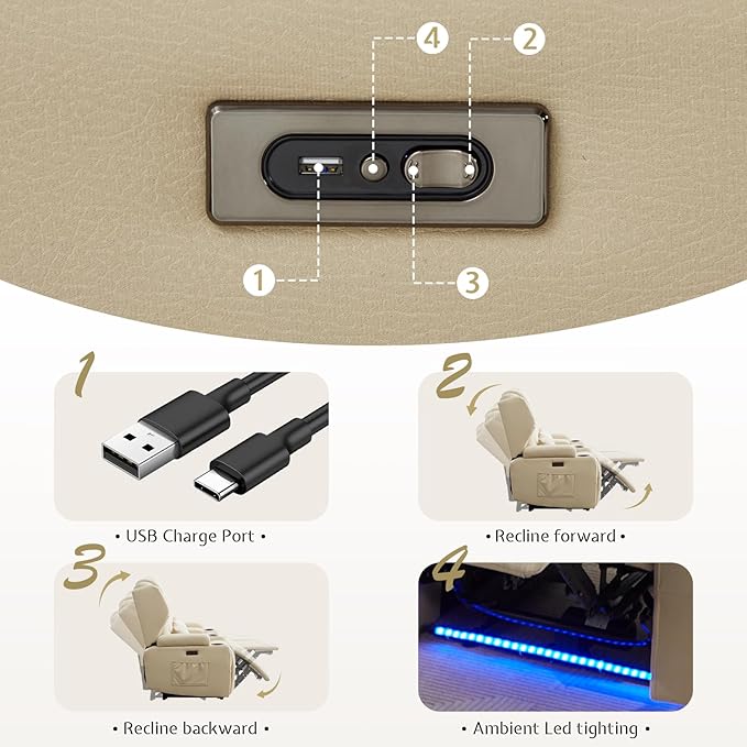 - Flip-Up Backrest: Flip up the backrest to create a separate seat. When lowered, it transforms into a practical wooden tabletop. Stay powered up with USB-A, USB-C ports, and 2 power outlets for charging devices. Enjoy four-color LED lighting at the base for a cozy, cinematic vibe. Perfect for movie nights, relaxing, or working from home
