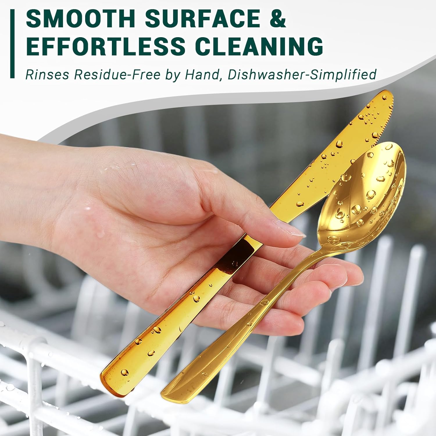 - 【EASY TO CLEAN】This stainless steel gold silverware set has a smooth surface that helps keep food from sticking. Better yet, this kitchen utensils set seamless design allows water and detergent—and it’s fully dishwasher safe, so post-meal care is a breeze to keep your cutlery looking pristine.For even better care, we recommend wiping it clean with a soft cloth; plus, drying it quickly right after washing will help maintain its shiny luster.