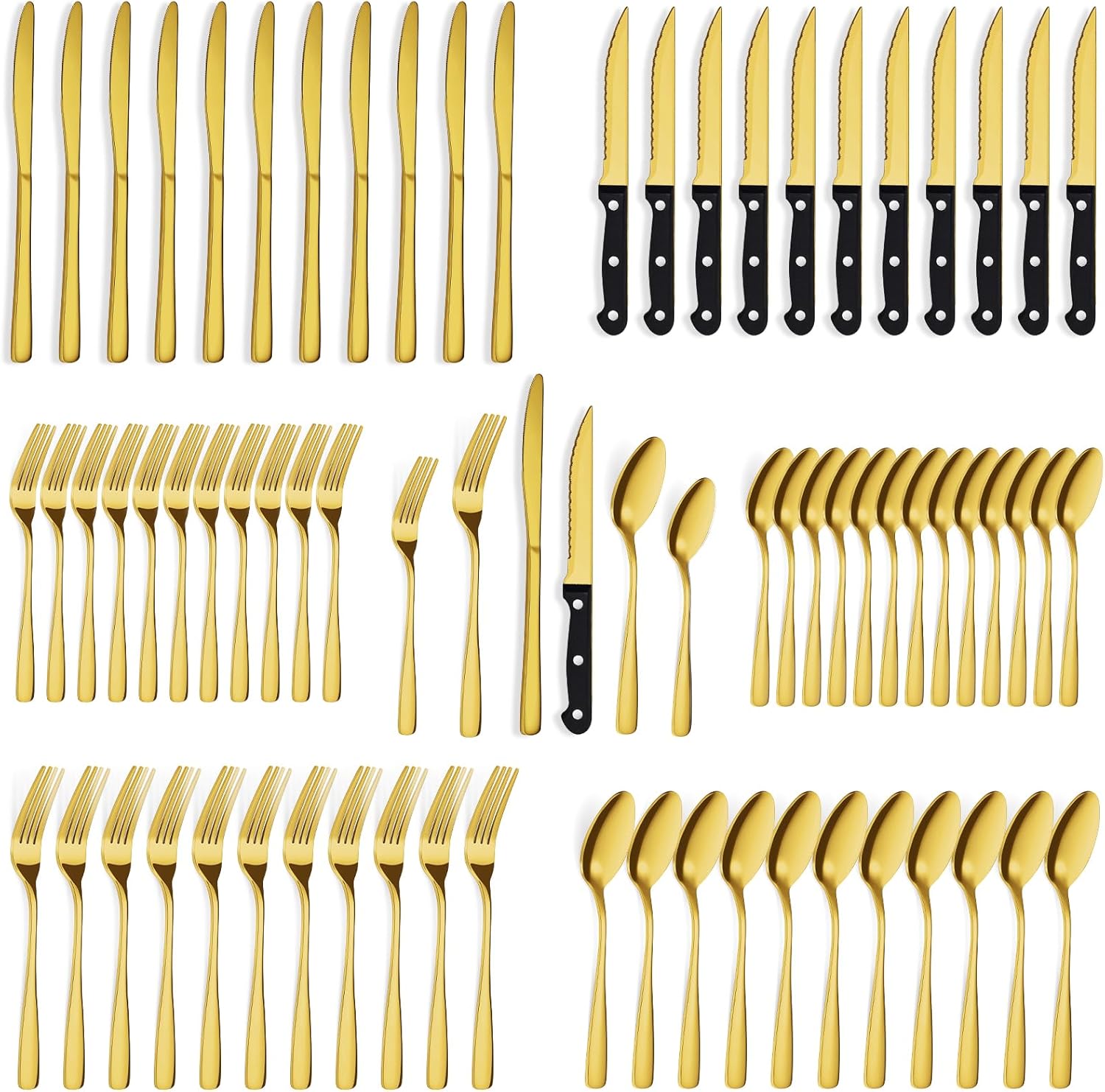 - 【PRACTICAL STEAK KNIFE】We’ve also included 12 extra premium steak knives to complement our stainless steel gold silverware set—each features a precision-forged serrated edge for effortless cutting. These steak knives boast a triple-rivet handle design that boosts structural stability, prevents loosening, offers perfect balance, and delivers a non-slip grip for precise control.