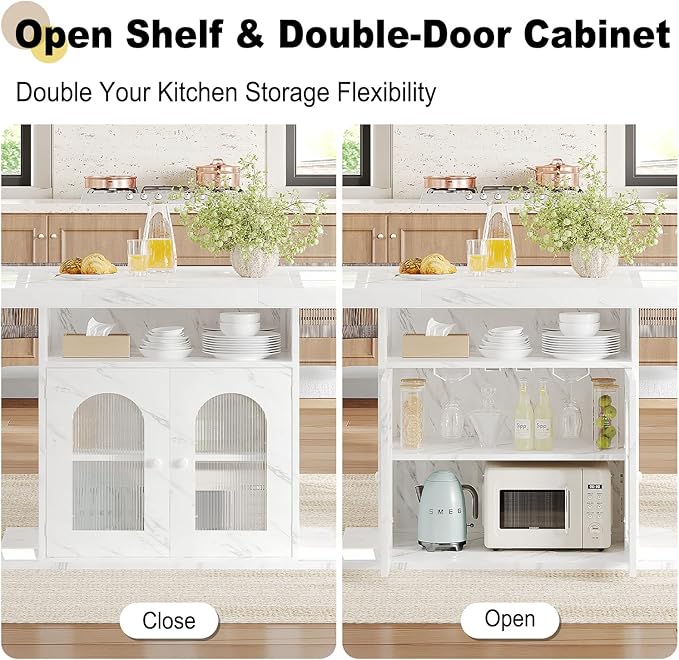 - Smart Storage with Open shelf, Cabinet & Wine Racks:Designed with a 22.44" × 14.57" × 5.9" open storage shelf for daily essentials, plus a lower cabinet with double arched acrylic doors. Inside are two adjustable shelves with 3 height options (2.5" spacing), perfect for storing dinnerware, appliances, or décor. Two built-in wine glass racks offer a convenient way to keep stemware neatly organized.