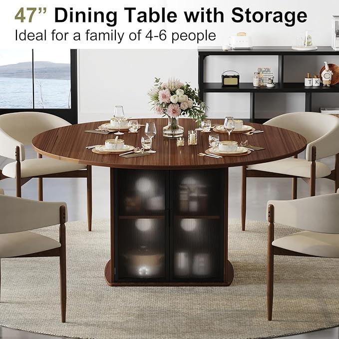 IBF 47" Round Dining Table with Fridge Storage Space, Circle Kitchen Table for 4 to 6 People, Dining Room Tables with Adjustable Shelf, Wood Dinner Tables for Home Kitchen, Walnut (Only Table)