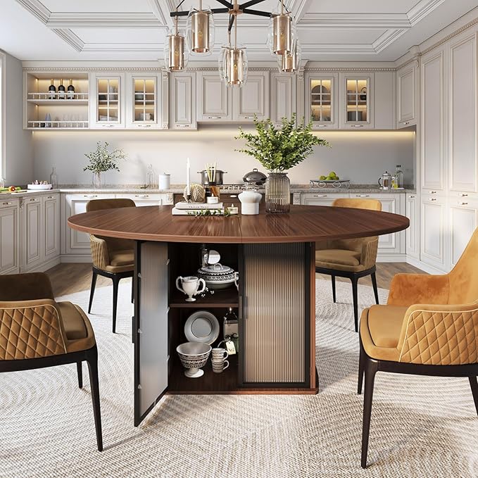 - 【Ideal Size for 4–6 People】 Measuring 47.24" in diameter and 29.53" high, this walnut round dining table with storage comfortably seats 4–6 people—perfect for both everyday meals and small gatherings. Its space-saving circular design fits seamlessly into small dining rooms, open-plan kitchens, or compact apartments, offering ample seating without crowding your space. The clean, mid-century modern silhouette brings style and functionality to any room