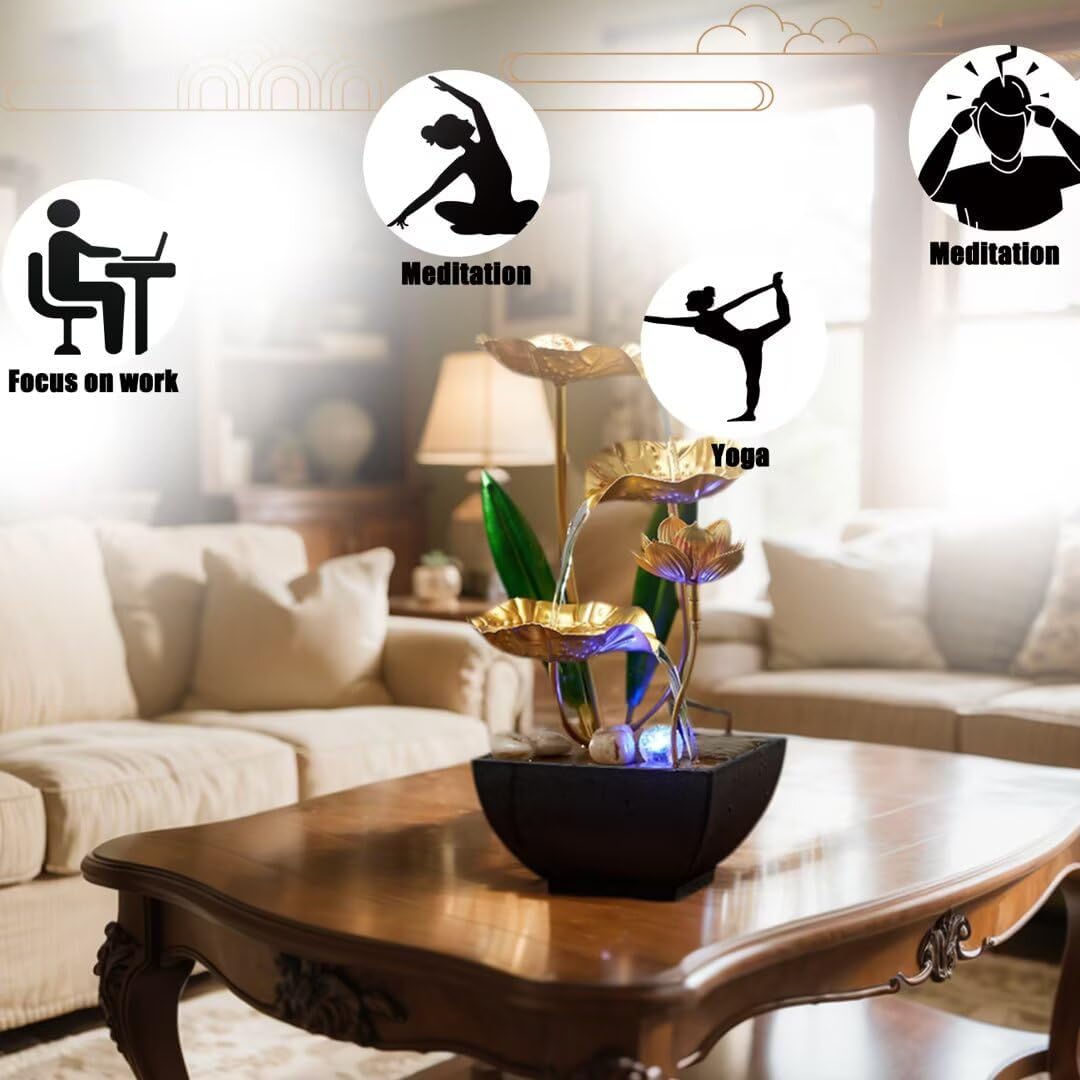 - APPEARANCE AND MATERIAL: This desktop water ornament is made of sturdy metal and plastic. The upper layer is a metal lotus leaf with 3 overlapping layers, and the lower seat is a plastic water container, which is reusable, safe and durable. It is perfect for relaxing after a hard day at work, immersing in sleep, meditation or yoga practice. Put it in your baby's room so that they can enjoy the sound of water and soft lights.