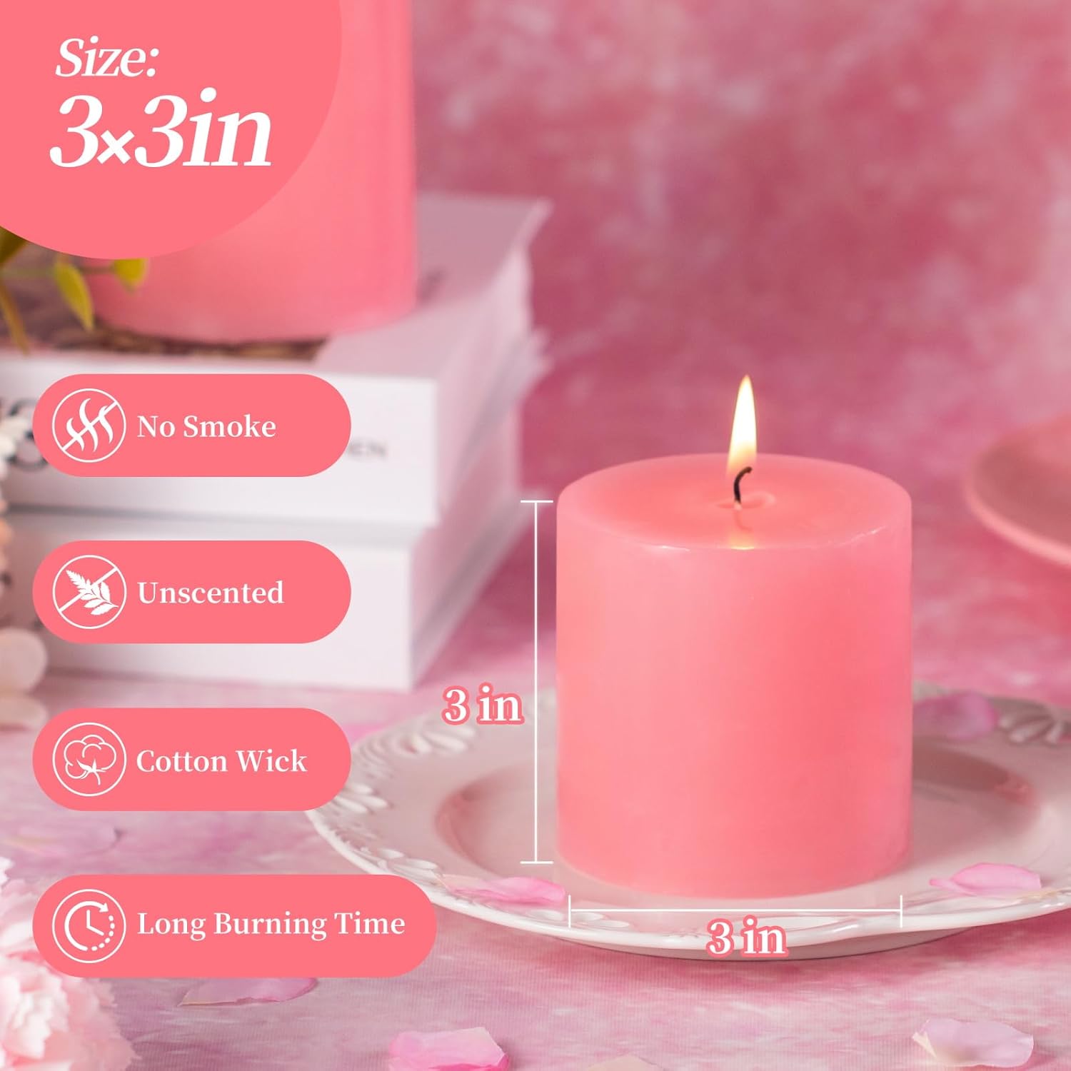 - GREAT VALUE SET: Each unscented pink pillar candle set comes with 3 pack candles of 3 x 3 inch. Pillar candle set comes wrapped in a sturdy divided cardboard box to ensure candles arrive neatly packaged and undamaged