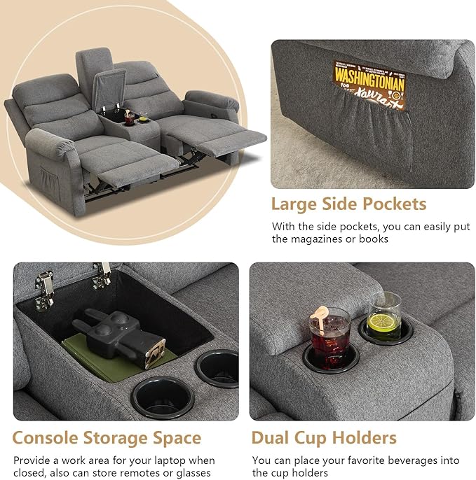 - Central Console with Functional Design: The recliner is equipped with a console between the seats, adding extra functionality. The integrated storage compartment and storage pockets provide spacious storage space for remotes, magazines or other small items that need to be kept nearby. It also comes with two cup holders for more drinks or snacks