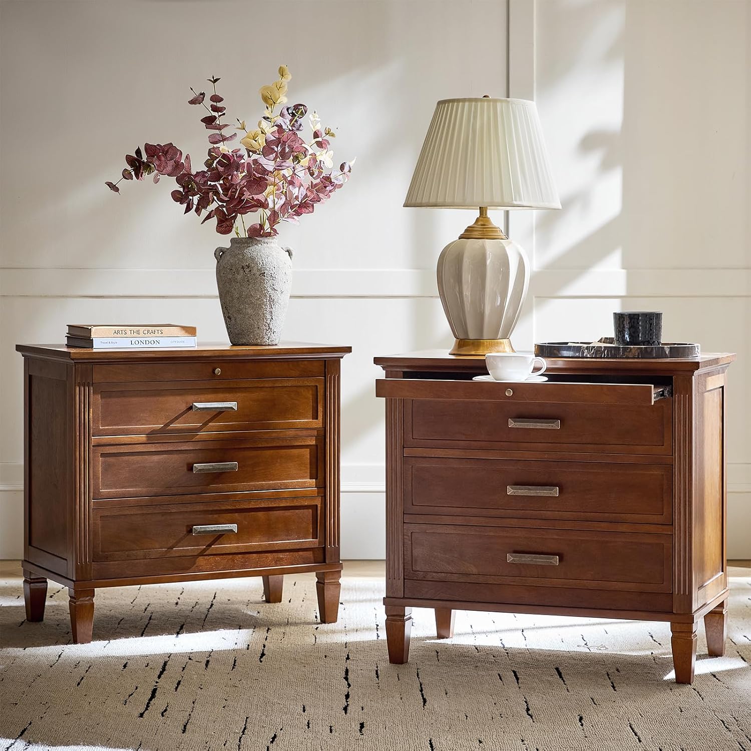 HULALA HOME Farmhouse Nightstand with Charging Station, Pull-Out Tray, 3 Drawers Nightstand with Solid Wood Legs, Wood Veneer Bedside Table with Open Shelf Set of 2, Walnut