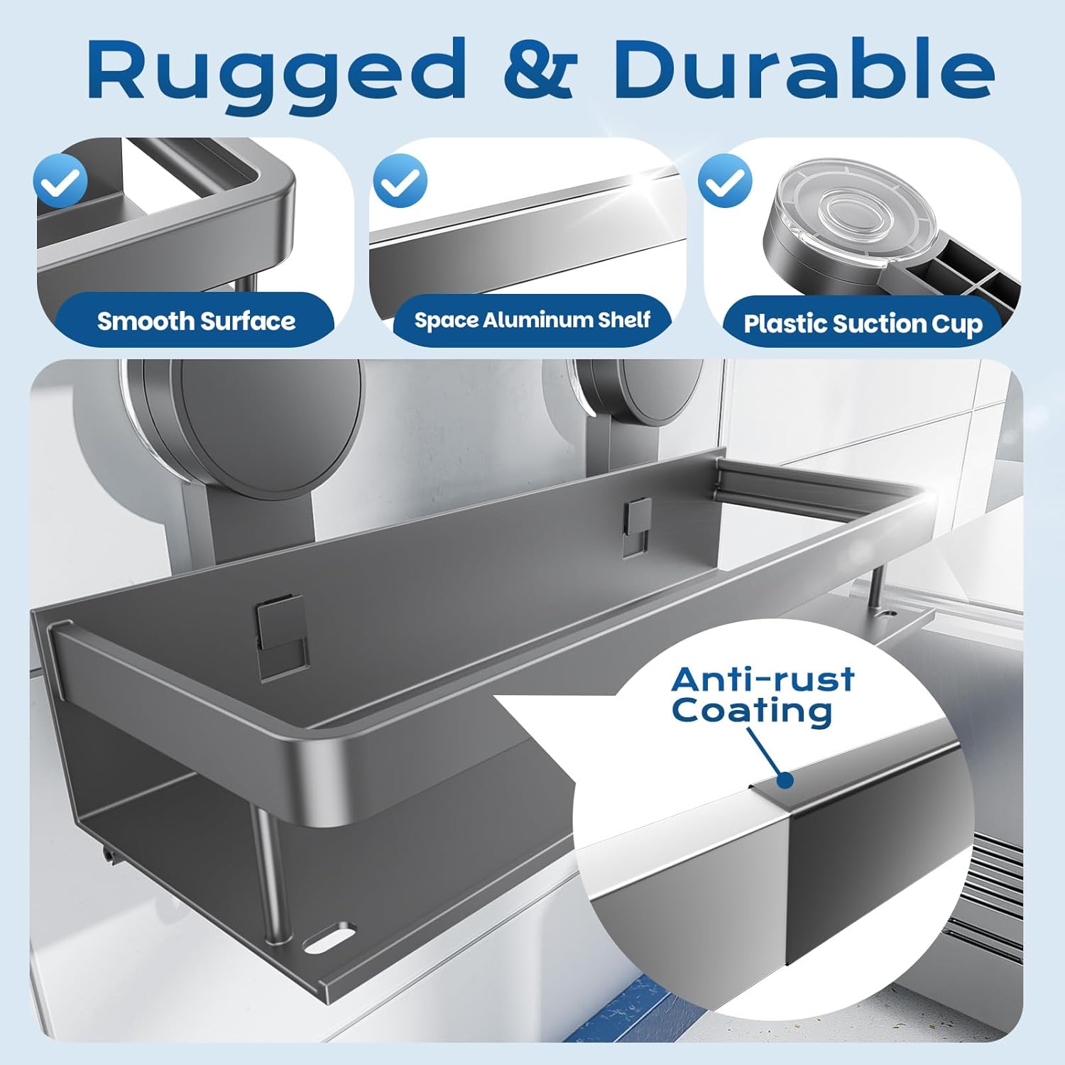 - BEAUTIFUL AND DURABLE:The suction cup shower caddy is made of high-strength, oil-resistant, waterproof, and rust-proof space aluminum, making it stable for use in bathrooms. It seamlessly integrates into modern home decor, making it an essential accessory for elevating the aesthetic of your living space