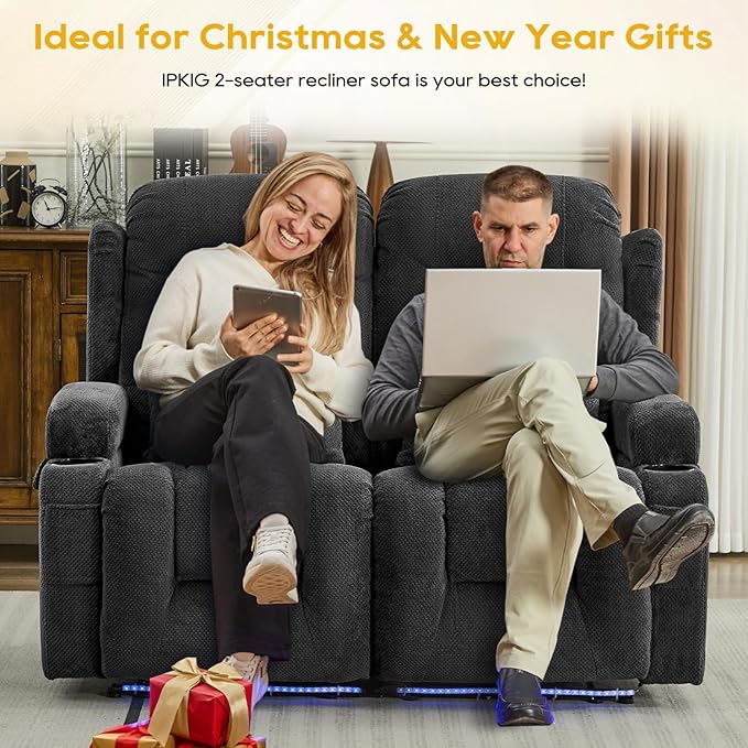 - UNIQUE AND MULTIFUNCTIONAL DESIGN: The design of this modern electric recliner loveseat takes into account versatility. Equipped with two intelligent control panels, it can easily adjust the tilt angle and LED lights. The cup holder is right at hand, where you can chat and enjoy leisure time while drinking