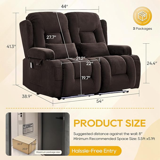 - OVERALL MEASUREMENTS: Less 30 mins installation, no additional tools required. 54"W x 38.9"D x 41.3" H. Seat only (single recliner) 21.2" x 22". From wall: 5-10". This chair happens to be rather versatile as well. Customers have reported power reclining sofa doing well in numerous settings ranging from living room to home theater. Its beautiful, durable construction shouldn’t have any issues fitting into any area where sofas are needed