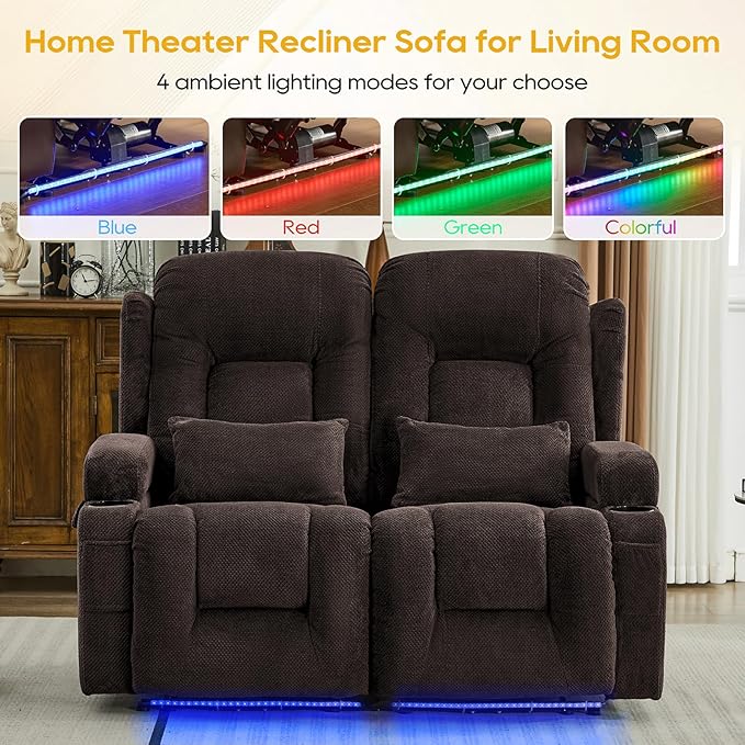 - RECLINER CHAIR WITH AMBIENT LIGHTING: Experience the perfect blend of comfort and ambiance with our 2-seater reclining sofa featuring strategically placed 4 colors LED lights, creating a captivating atmosphere. You can customize the lighting colors to match your mood or the content you are enjoying. Whether you desire a vibrant and energetic atmosphere or a softer and more intimate environment, the ambient lighting enhances the overall aesthetic appeal of your home theater