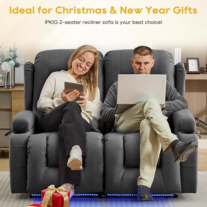 - UNIQUE AND MULTIFUNCTIONAL DESIGN: The design of this modern electric recliner loveseat takes into account versatility. Equipped with two intelligent control panels, it can easily adjust the tilt angle and LED lights. The cup holder is right at hand, where you can chat and enjoy leisure time while drinking