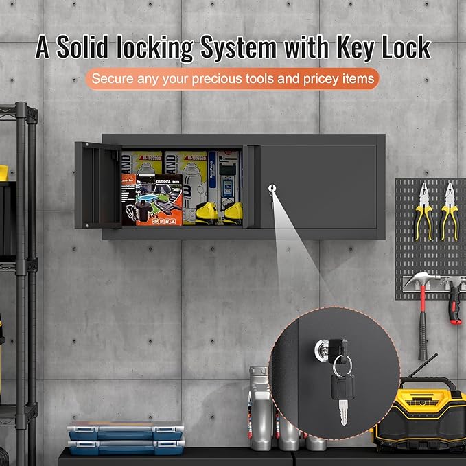 - 『HANGING WALL CABINET』 31.5"W x 11.8"D x 12.8"H-small floating tool cabinet can effectively utilize the upper wall space, providing you with more storage space. Safety locked cupboards allow you to store garage tools to keep children and pets from touching them