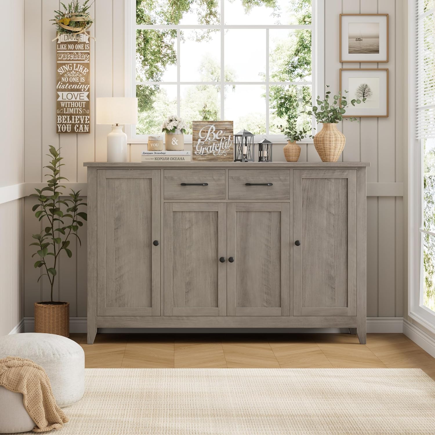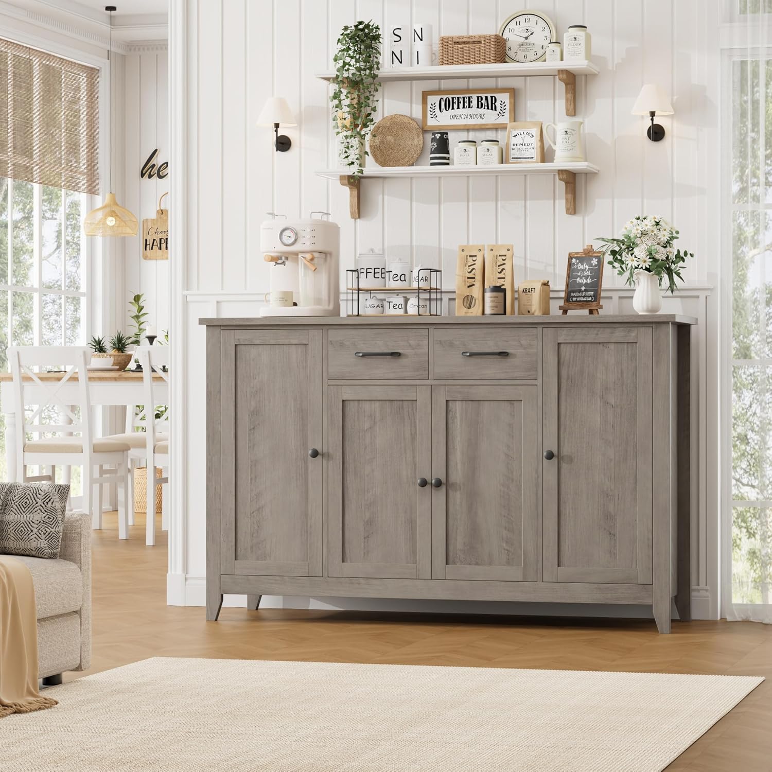 - Ample Storage Space: This buffet cabinet has a 4-door enclosed compartment, offering generous room for cookware, tableware and daily essentials. It also includes 2 smooth-glide drawers that organize utensils neatly, while the roomy tabletop acts as a dual hub - great for decor accents and small appliances like coffee makers