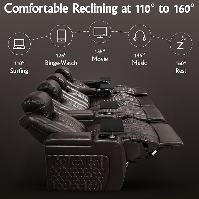 Home Theater Seating, Living Room, Heat & Massage, Powered Headrest, Powered Lumbar, Italian Leather, Powered Recline, Single Recliner (Coffee Color, Row of 4 Loveseat Middle)