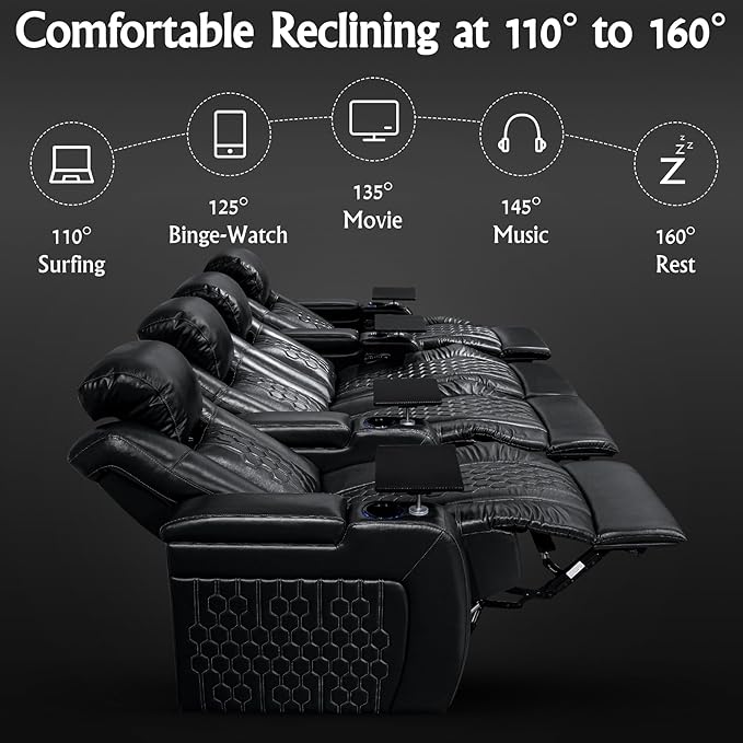 Home Theater Seating, Living Room, Heat & Massage, Powered Headrest, Powered Lumbar, Italian Leather, Powered Recline, Single Recliner (Black, Row of 4 Loveseat Middle)