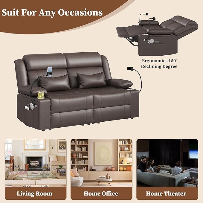 Home Theater Seating,RV Reclining Sofa Set with Adjustable Headrest, Recliner Sofa with Heat and USB&Type-C, Dawer & Cup Holders, 150° Recline for RV & Living Room(Loveseat Brown)